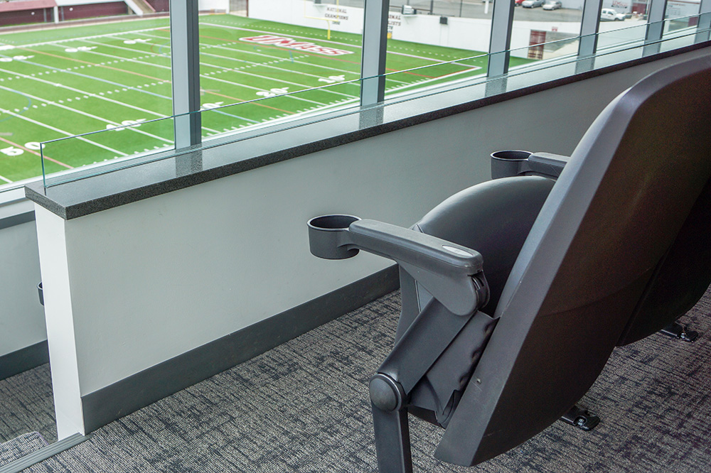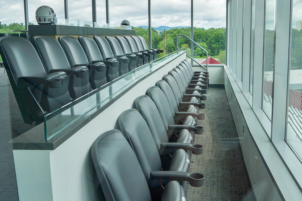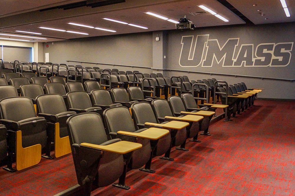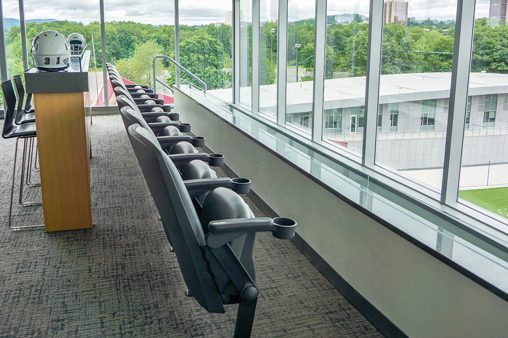 The UMass Amherst Football Performance Center is a state of the art facility that centralizes all the facilities needed to support the football program. Featured among these are an auditorium for team meetings and the Martina and Richard Jacobson Press & Skybox Complex. Both are outfitted with Hussey Seating’s Quattro series fixed seating. These comfortable, versatile auditorium-style chairs have tablet arms in the auditorium and cup holders in the skybox.