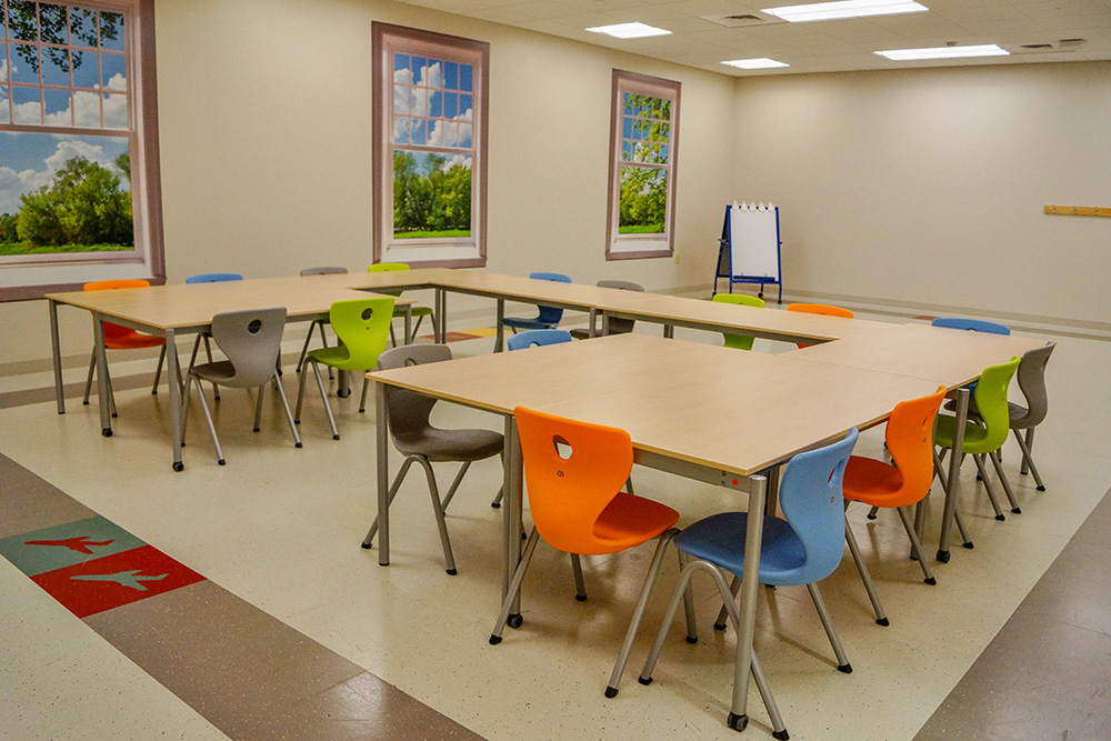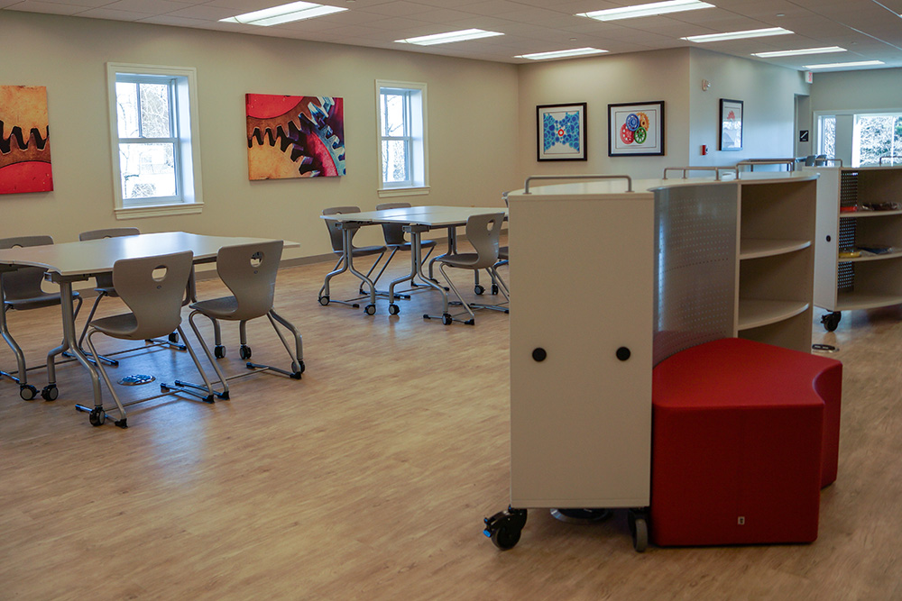 The renovation and expansion of the Raymond Library Brings together the traditional and the contemporary. New furniture updates the existing spaces with furniture having a more traditional style, while the new areas, which include a maker space and children’s activity center, take advantage of flexible, colorful contemporary furnishings.