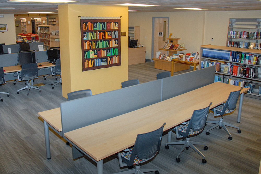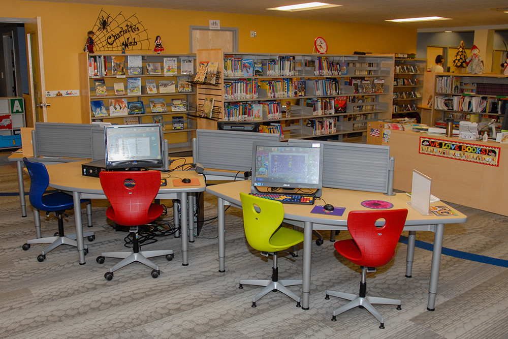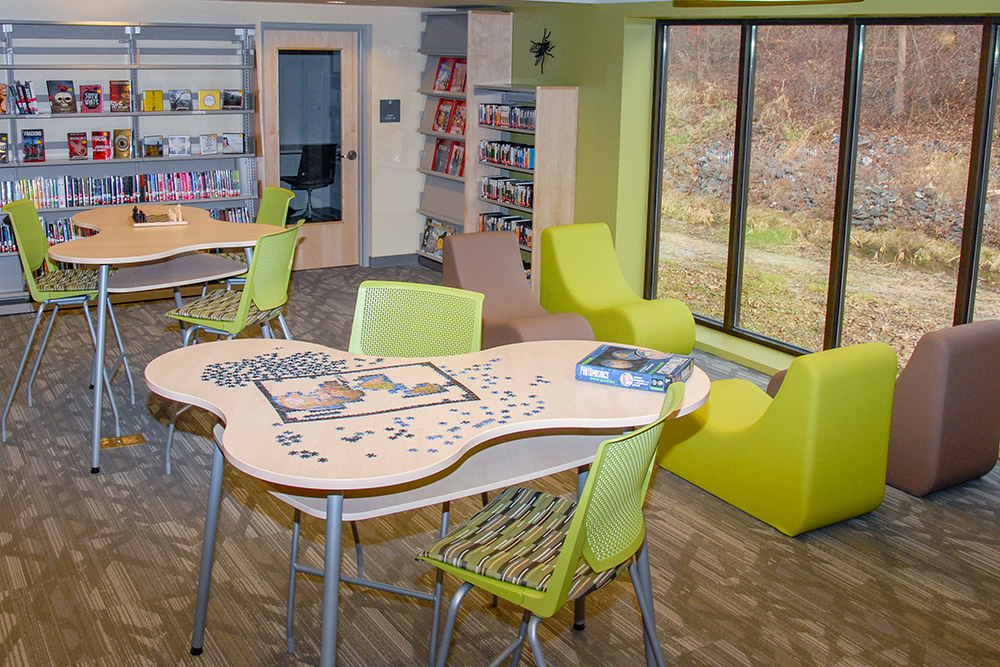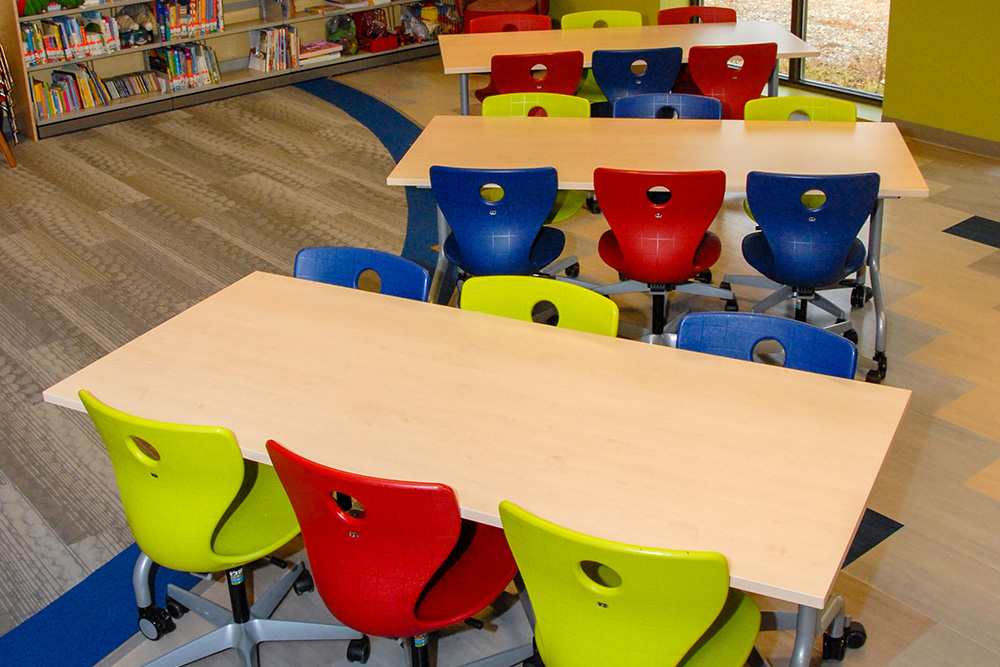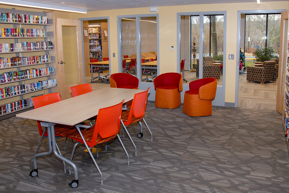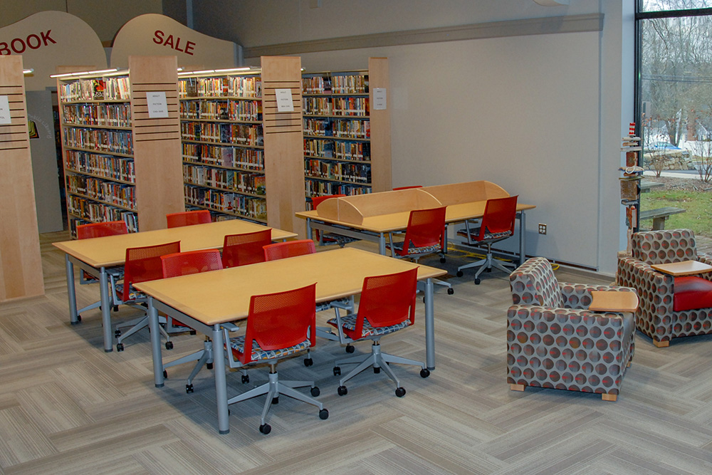 The renovation of the Tolland Public Library included a variety of spaces to be furnished. RHL provided furnishings that supported the numerous activities while adding interest and color to the spaces. Sturdy tables with comfortable seating fill the open stack and technology spaces while playfully shaped tables and chairs fill the game area. The children’s space uses brightly-colored chairs with flip-top mobile tables that are easily reconfigured to suit the activity at hand.